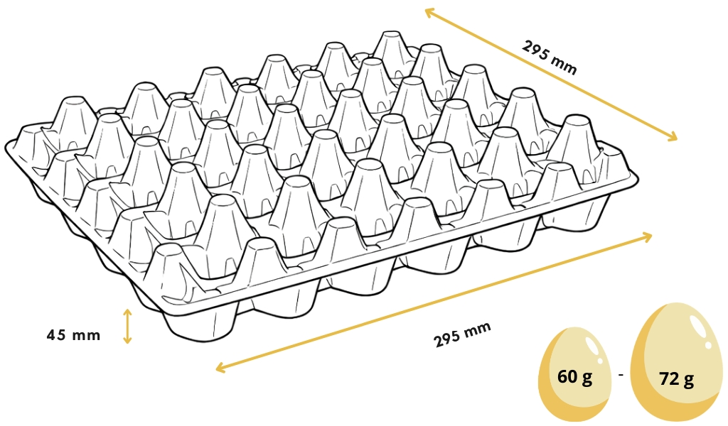 | E73 (Euro Tray) proložka na vejce (30 vajec, 60–72 g) | 295 mm | 295 mm | 48 mm | 125 ks | 4500 ks | 1200 mm * 800 mm * 2830 mm |